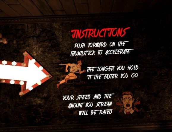 The Gauntlet is very viewable off to the side of the main lobby. With a slightly different take on the spooky walkthrough, The Gauntlet brings a tiny bit of gameplay into the experience. You will be required to move as quickly as possible through the Gauntlet run. As you push your controller forward you will move increasingly faster. That is until you hit something. Lots of “somethings” will be flying in front of you. Your once-clear path will quickly fill up with obstacles and scares. The time will be ticking and once you reach the end you will get your score. Easy and fun to pass the headset back and forth to compete against your friends.