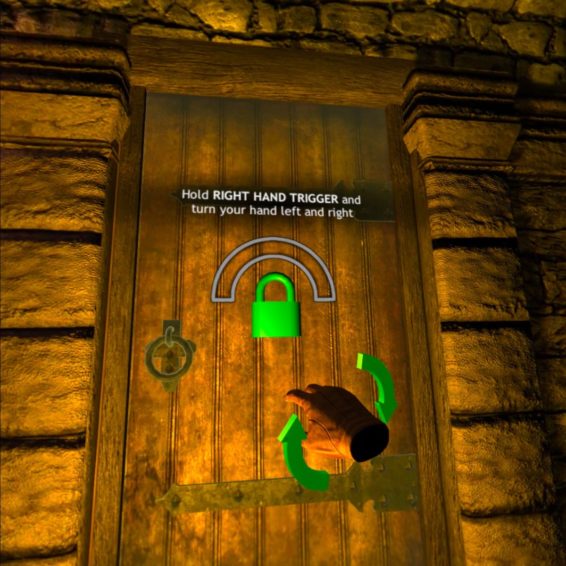 When you approach a locked door or chest you turn rapidly your controller back and forth to unlock it. Depending on the color of the lock, it will take more time to unlock it. This requires a few turns that take precious time. You can also use one of the locks picks you find for this purpose. I found I didn’t want to open the menu and bother with the lockpicks too often.