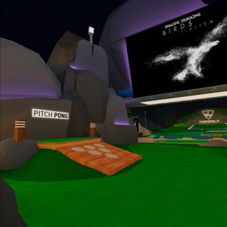 Entering the Top Golf VR lounge has the same chill atmosphere as real life. There are couches, a fireplace, mood lighting, party mini-games, video screens, and places to hang out with your friends.