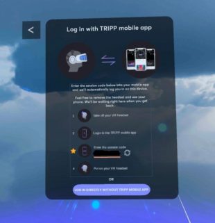 Once you sign up, you can download a mobile app version of Tripp to keep track of your habits and sync up your account. Then you need to boot up the VR experience. You can log in with your email and password, or you can use your mobile app to sync with the VR app.